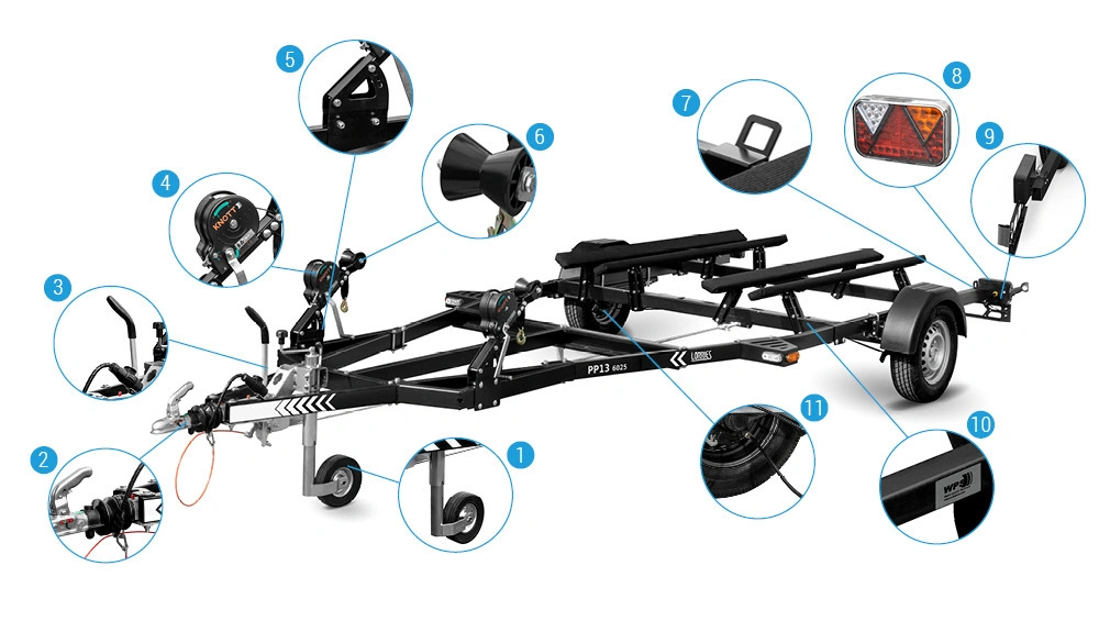 Przyczepa do transportu dwóch skuterów wodnych wyposażona jest w cztery płozy wykonane z impregnowanego drewna pokrytego trwałym obiciem. Regulowane w dwóch płaszczyznach płozy umożliwiają dostosowanie przyczepy do skutera o dowolnej szerokości.
